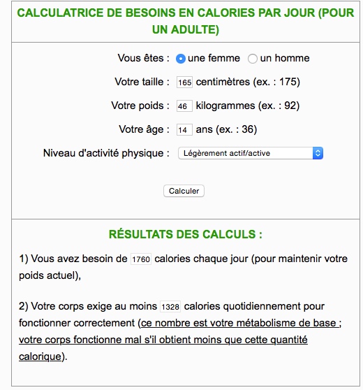 Moi, par exemple, mon nombre de calories est 1760 (image si dessous), or si je n'en mange que 1328 mon corps fonctionnera toujours normalement et mincira.